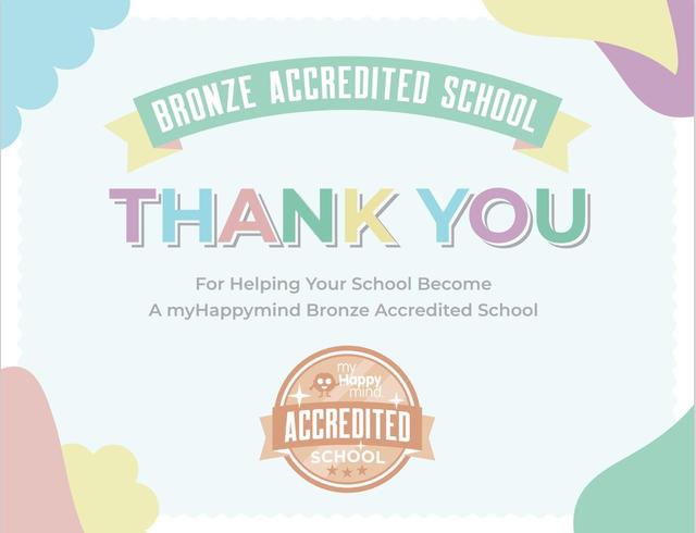 We are proud to announce that our school is officially a myHappymind Bronze Accredited school. The Accreditation recognises schools that are embedding the myHappymind curriculum into school life and taking real action to improve the mental health and wellbeing of the school community.